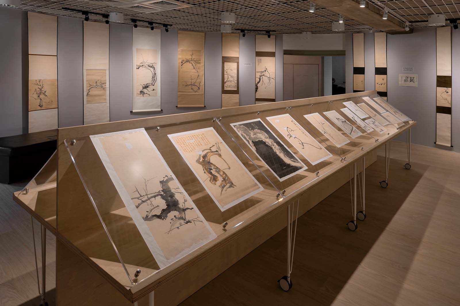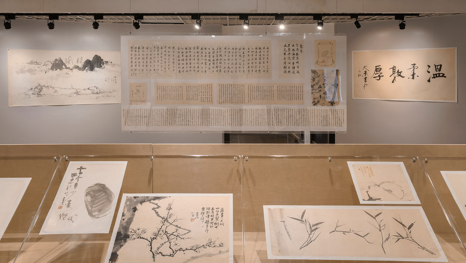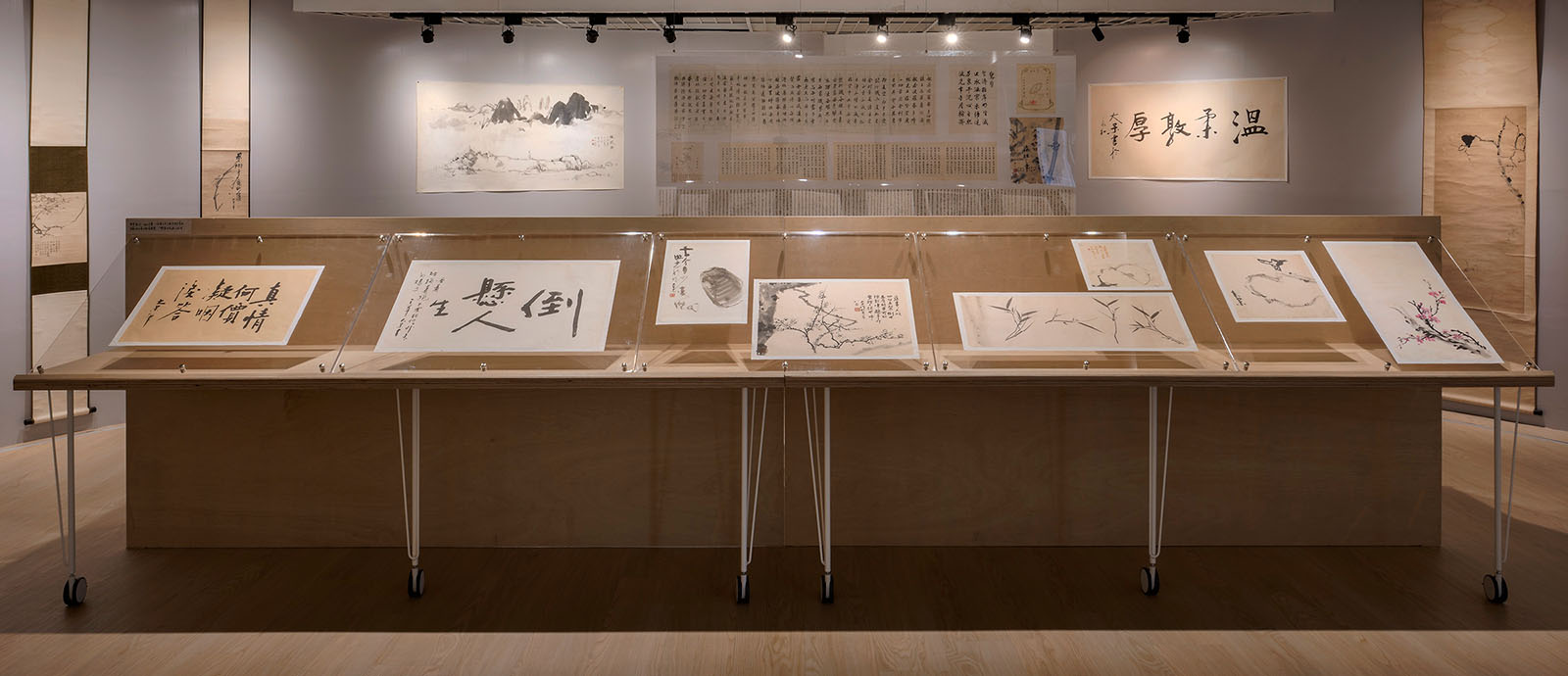 二、展場周圈圓弧牆面的「時間軌跡」,展出王鎮華老師學生時期的書畫展覽作品。這些裝裱好的老畫卷,從王鎮華老師高中大學展覽完便悉心捲好收藏,畫卷上泛黃的註記,盡是當年意氣風發的王老師,在心愛的畫卷上所留下的痕跡,不知他當年可曾想過,當這些畫卷再度展開時,自己已不在人世嗎……