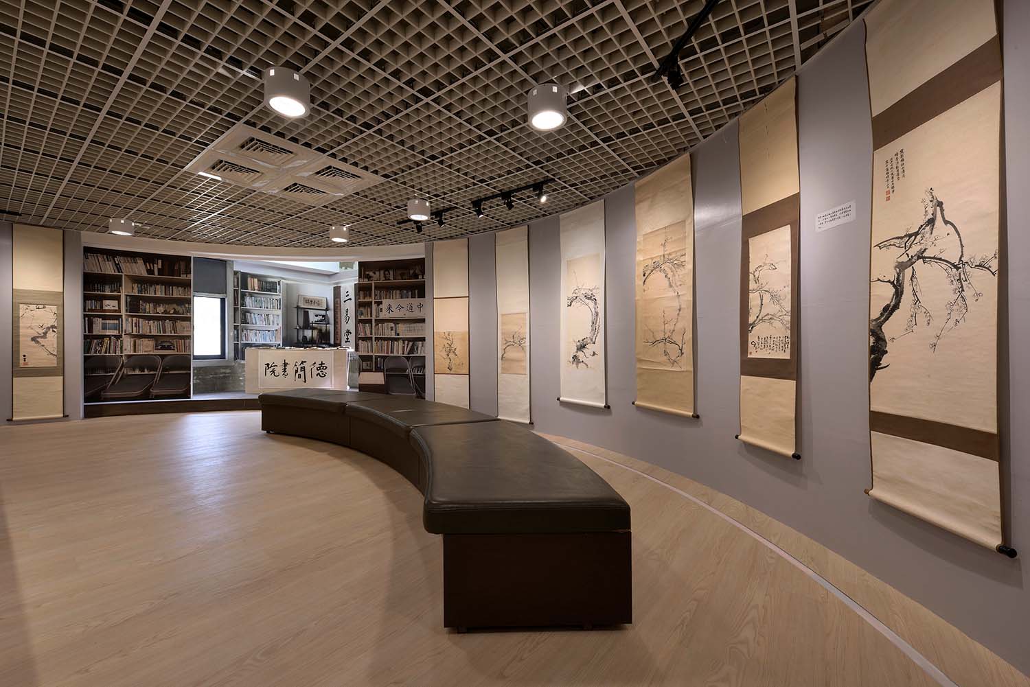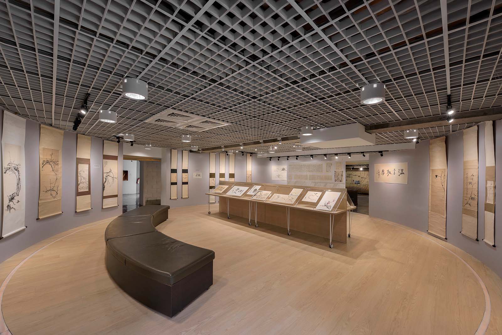 感謝高雄市政府客家委員會楊瑞霞主委、主任的大力支持,非常開心能在美濃客家文物館主題館二樓圓形展廳展出「二部曲由藝入道——信步回家|王鎮華與林怡玎回顧展」!展場空間完整而特性鮮明,我特別喜愛位居展場一角的小空間,原做儲藏使用,四扇對外推窗可以看見周遭環境的綠意,是此圓形展廳重要的呼吸點,因此在展場設計中也特別將此小空間規劃為重現書院意象的精神空間。