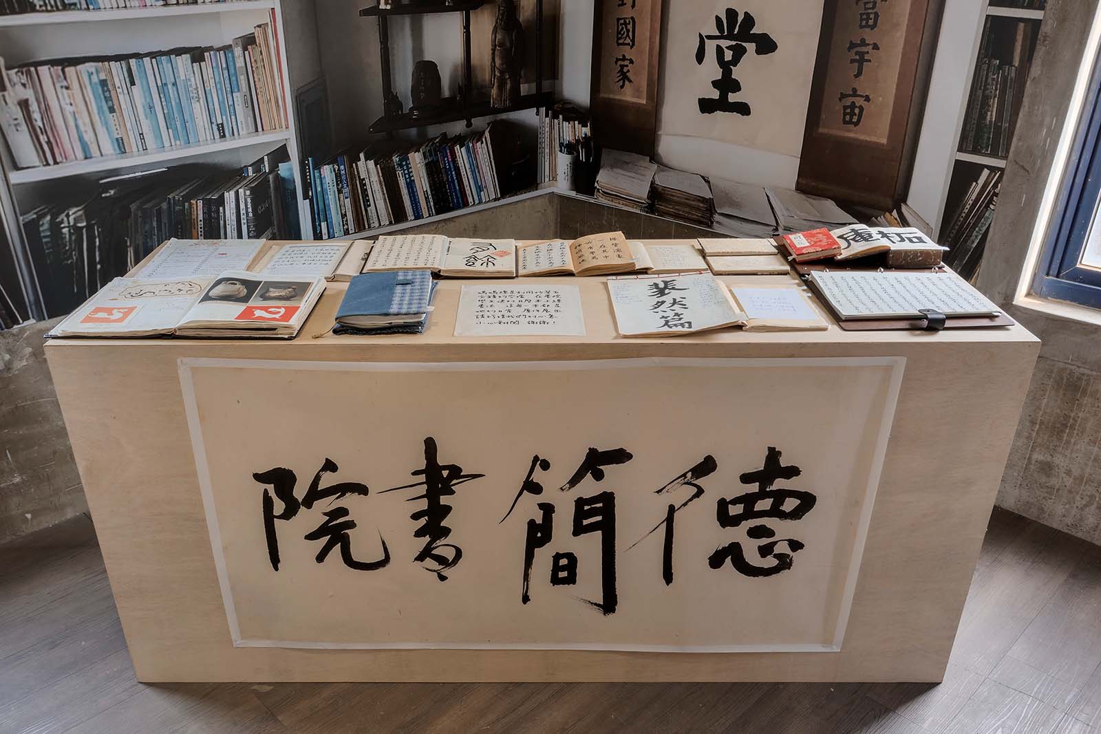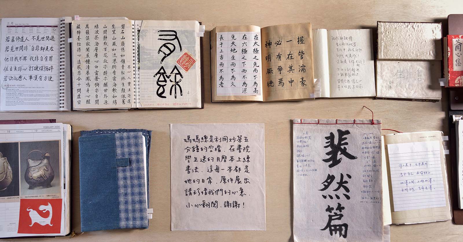 四、靠窗一角的「生活角隅」,重現德簡書院的主牆面——王鎮華老師書桌後方的書牆,希望熟悉書院的朋友一踏進展場便如同回到書院——耳邊響起王老師「有主有體,活得感心」的聲音,這區是象徵書院的精神空間。生活角隅小桌上展示師母林怡玎與王鎮華老師的日常筆記、月曆與老相簿,師母惜物,大小樣貌不同的月曆本都成為他日常零碎時間練書法的習作本,炒菜五分鐘的空檔,坐在廚房旁的小桌,抓緊時間練字,這就是我們家的日常。